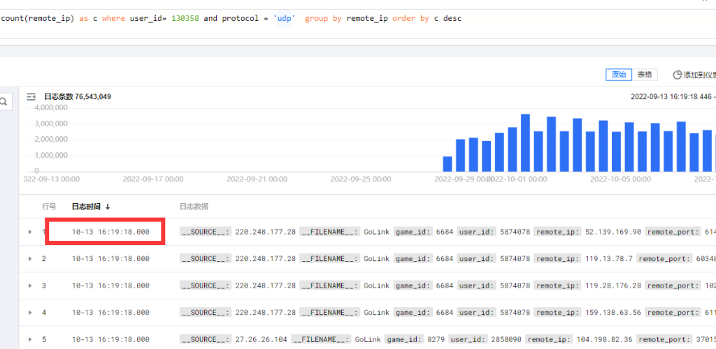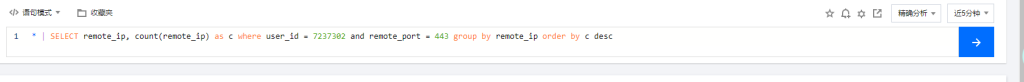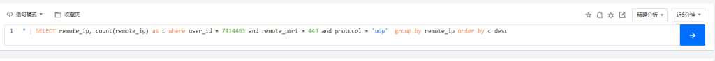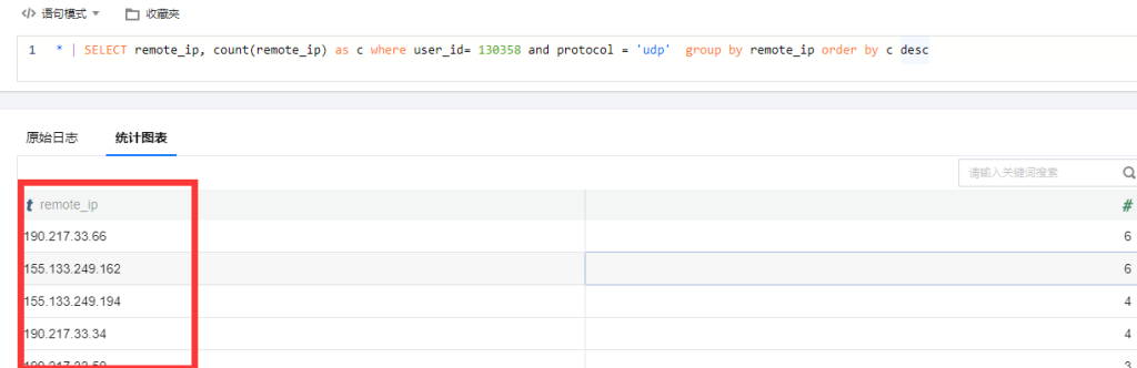 4、原始日志里面的remote_port字段可以在语法中and user_id and remote_port = 80添加,也可以删除protocol条件单独进行查询。remote_port为ip的端口字段,需要注意remote_port为long整型,不能添加单引号,添加之后会变成字符串,导致语法错误无法查询。